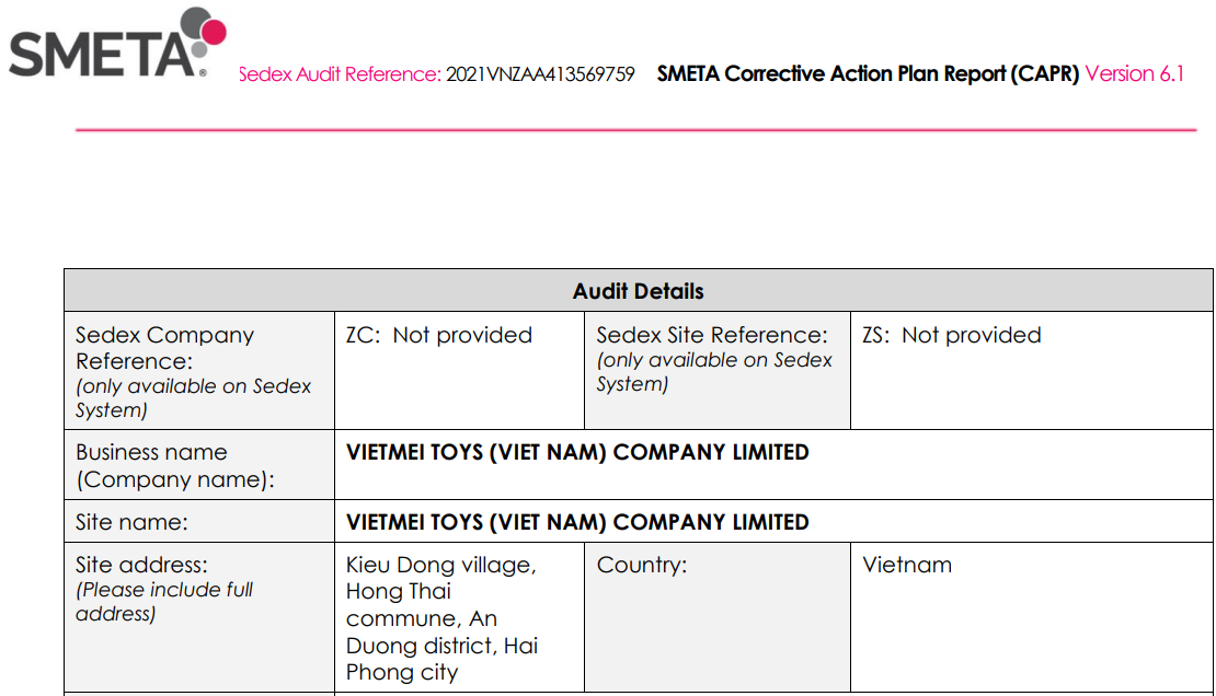 越美玩具(越南)有限公司【VIETMEI TOYS (VIET NAM) COMPANY LIMITED】在創(chuàng)思維技術服務(越南)有限公司輔導中2021年順利通過ITS突擊審核的Sedex 4P驗廠,創(chuàng)思維2020年還幫助貴司順利通過ICTI驗廠。