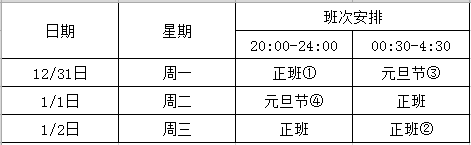 以2019年元旦節為例。法定節假日是1月1日,周二工作日。如下圖實例,正班①②為晚班員工的正班工作時段,工廠如未安排員工上班,需支付停工待料工資。元旦節③4為法定節假日,如安排員工休息,支付正班工資。